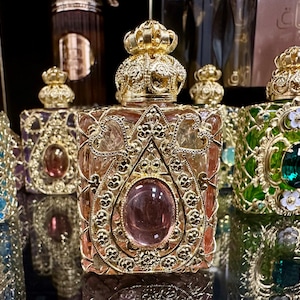 Indulge in luxury with this exquisite glass bottle, adorned with light-green rhinestones and a captivating uranium cabochon. Perfect for storing and applying your favorite oil perfumes, complete with dipping sticks for a seamless application experience.